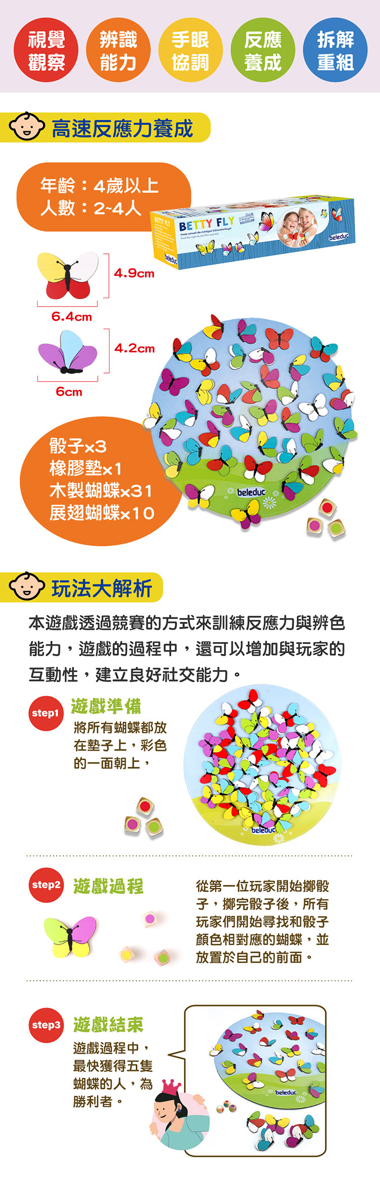 配件數量 : [骰子] 3個、[橡膠墊] 1張、[木製蝴蝶] 41個