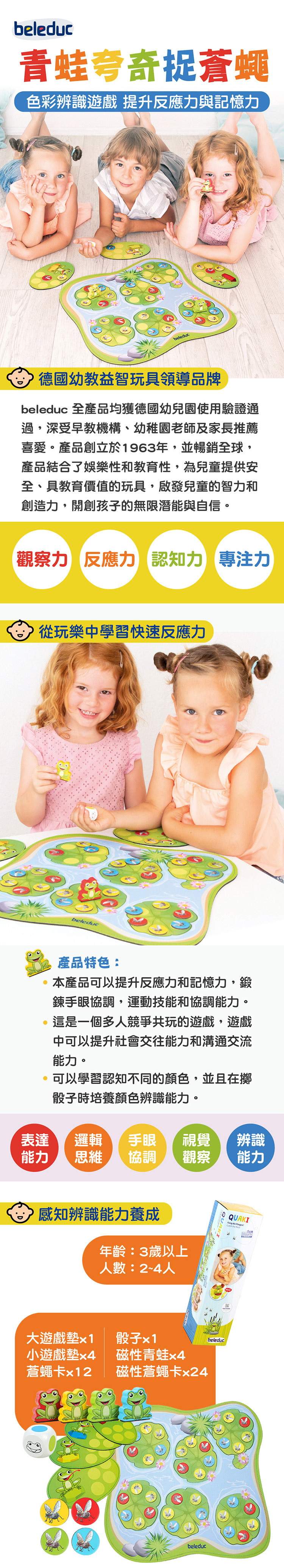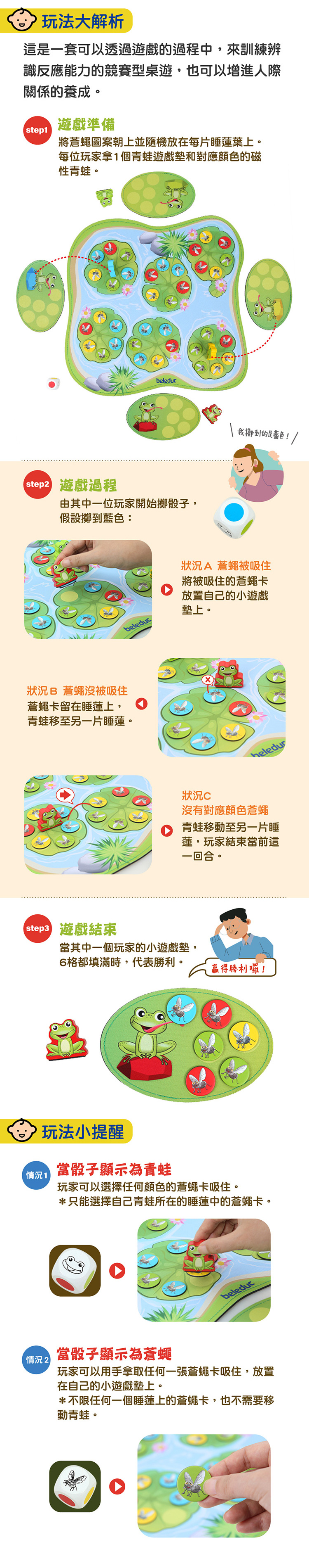 配件數量 : [大遊戲墊] 1張、[小遊戲墊] 4張、[蒼蠅卡] 12張、[磁性蒼蠅卡] 24張、[磁性青蛙] 4個、[骰子] 1個