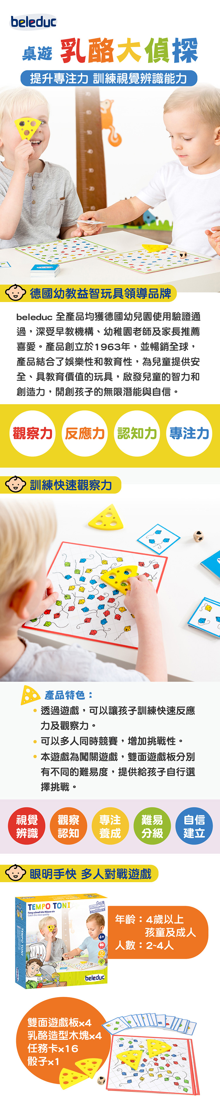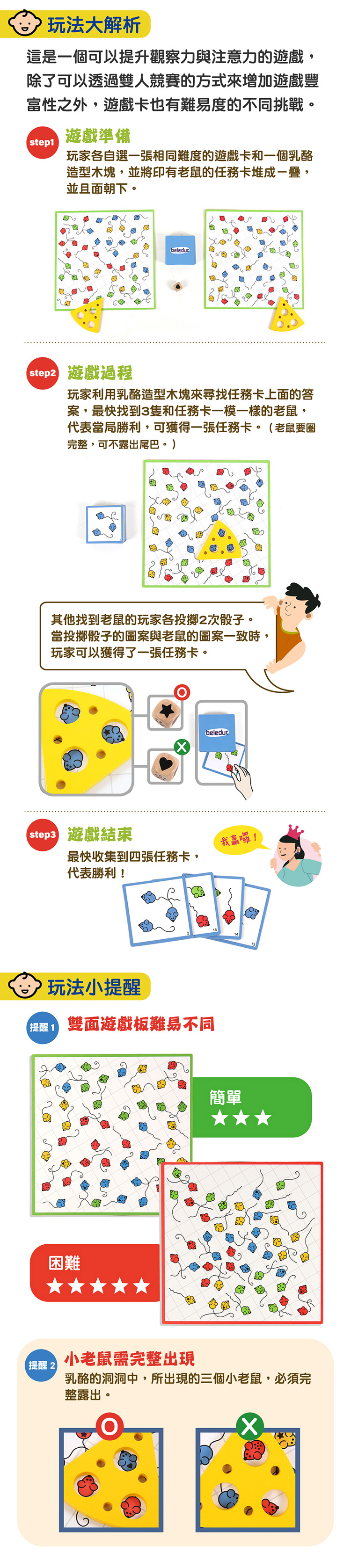 配件數量 : [雙面遊戲板] 4張、[乳酪造型木塊] 4塊、[任務卡] 16張、[骰子] 1個