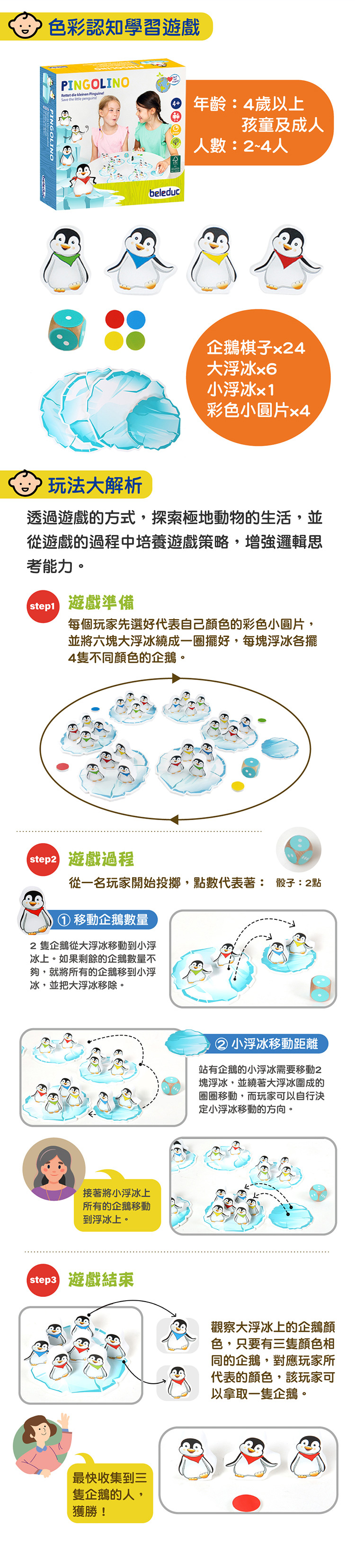 配件數量 : [企鵝旗子] 24個、[大浮冰] 6塊、[小浮冰] 1塊、[彩色小圓片] 4個、[骰子] 1個